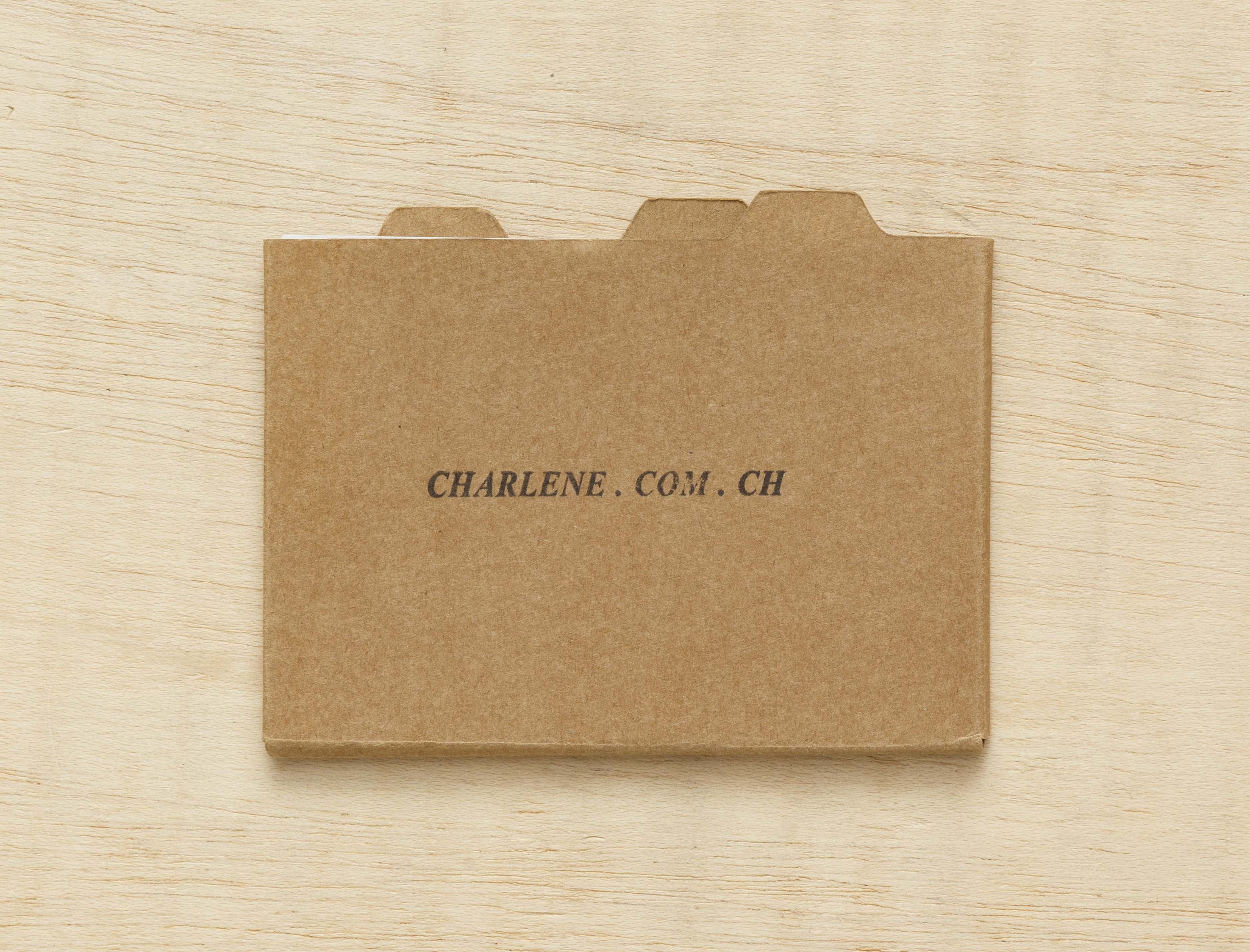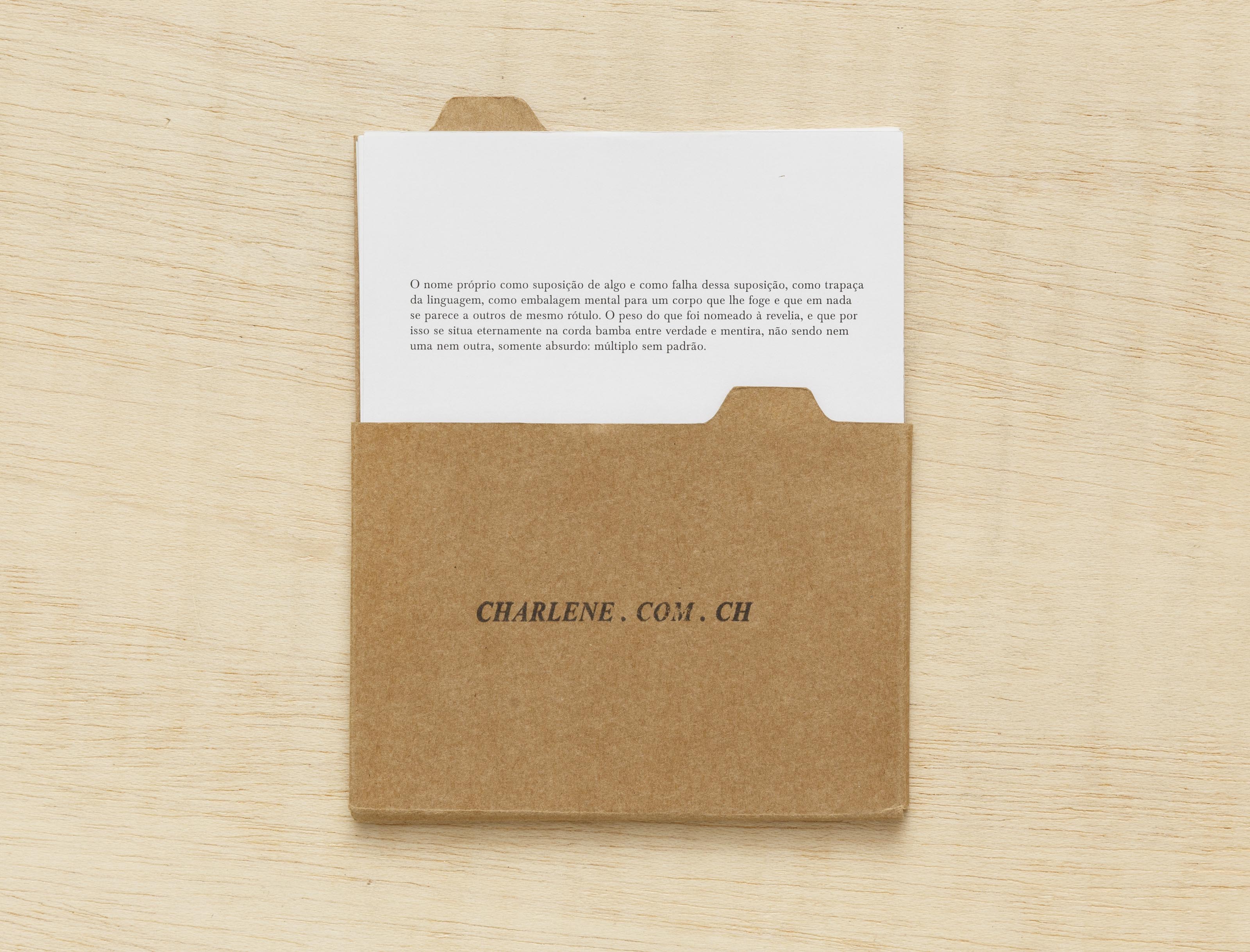 [Publicação com dois capítulos: o primeiro com imagens referentes ao nome Charlene, o segundo com capturas de tela de perfis no Facebook de pessoas com o mesmo nome e sobrenome da autora. A sequência de páginas emula a cronologia da vida de uma mesma Charlene, da infância à morte (e eventual ressurreição). O título é um jogo entre um suposto domínio .com.ch , inexistente, e a frase que a autora sempre diz quando alguém solicita escrever seu nome.]