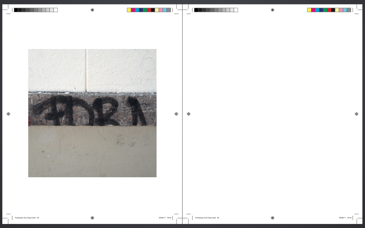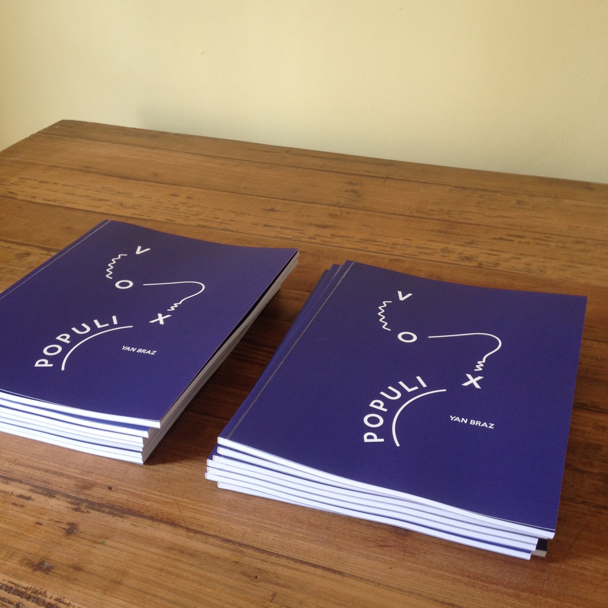 Vox Populi, publicação independente, foi organizada com fotografias de pichações anônimas, encontradas na rua e coletadas com o auxílio da câmera de um telefone celular ao longo de diversas caminhadas empreendidas entre os dias 9 de janeiro e 30 de março de 2017 na cidade do Rio de Janeiro. Concluído o período de saídas e coletas regulares a fim de reunir um repertório vocabular, este usado na etapa seguinte, a composição final referente ao espaço-tempo percorrido originou uma sintaxe-percurso singular, retornada pública. Planejada para ser uma exposição móvel, a publicação encontra no suporte livro um espaço expositivo onde se cumpre e que busca enfatizar sua estrutura conceitual movente. Vox Populi é imagem em movimento.